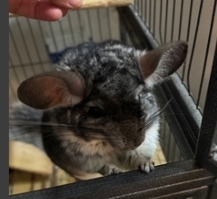 Standard grey chinchilla that is super sweet. He is around 7-8 years old. He enjoys head and ear scratches and ear rubs as well. Dusty is potty trained.