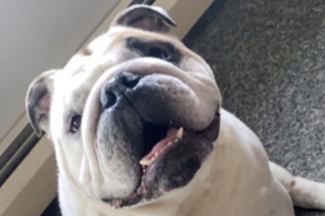 Looking to rehome snuggly English bulldog named Diesel due to moving situation. He is very friendly and loves to lounge on the couch and watch a movie!